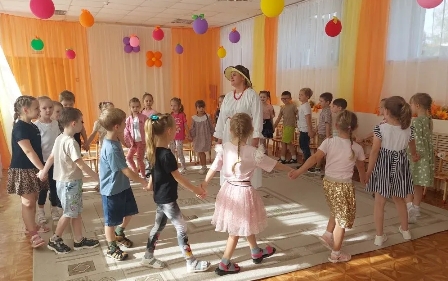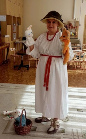 Беседа проходила в игровой форме. Тётушка-лесовичок рассказала детям сказку о том, какие изменения в природе и в жизни людей происходят осенью, как лесные звери готовятся к зиме. Ребята с большим увлечением играли в народные игры.